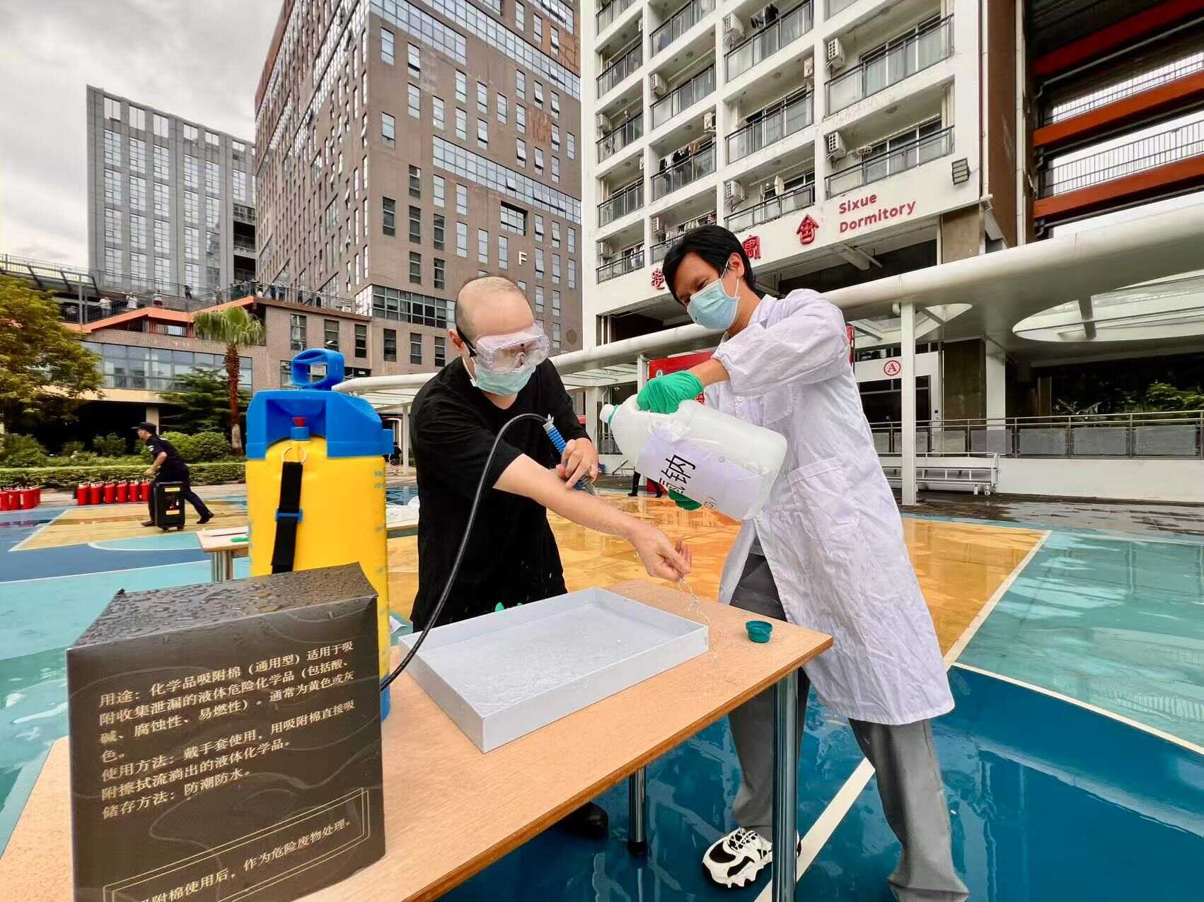 4、全员灭火实操:150具灭火器组成训练矩阵,师生轮番操作掌握"提拔握压"四字诀。